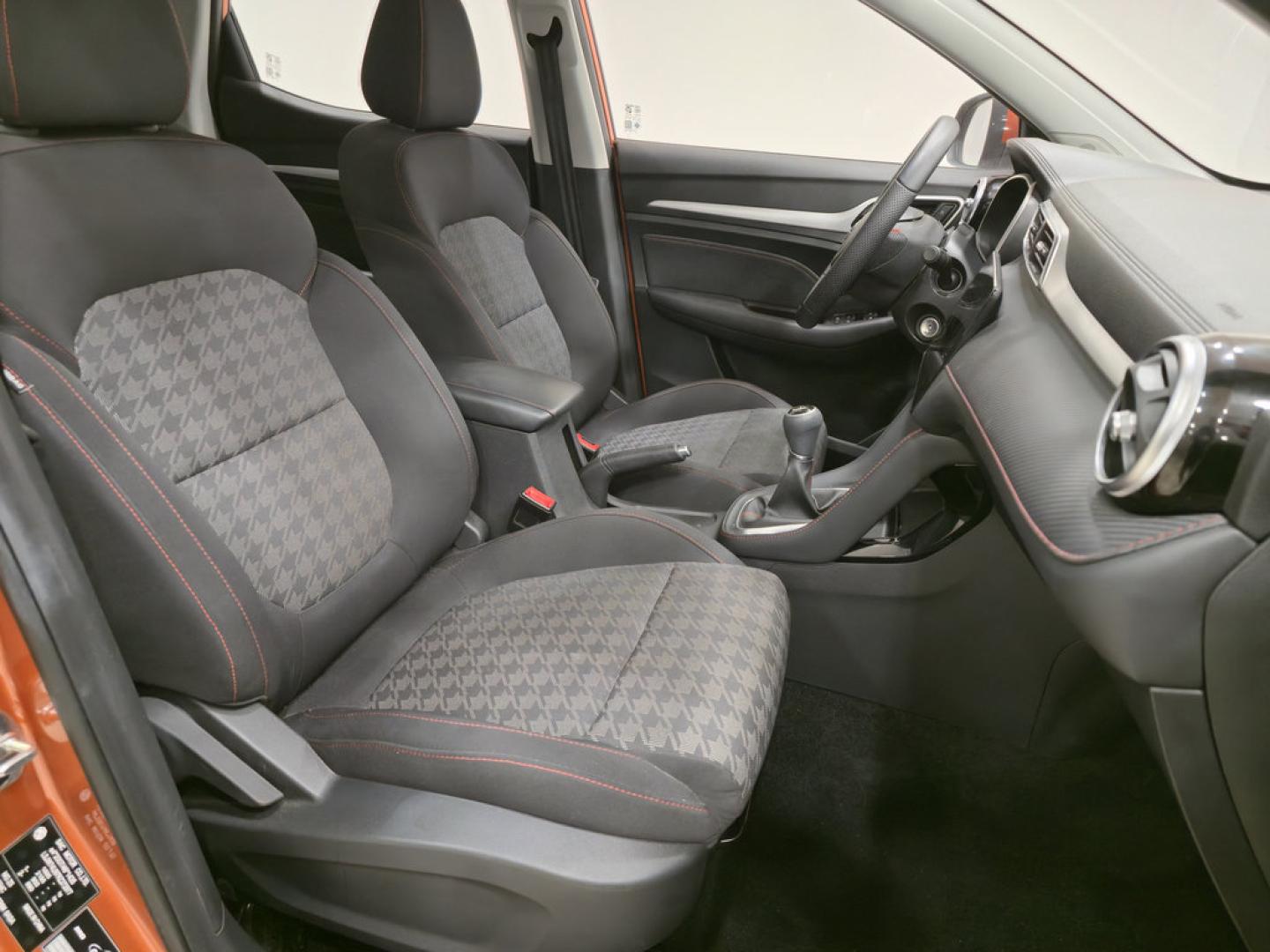 - Asientos de tela (material principal) y de cuero sintético (material secundario)